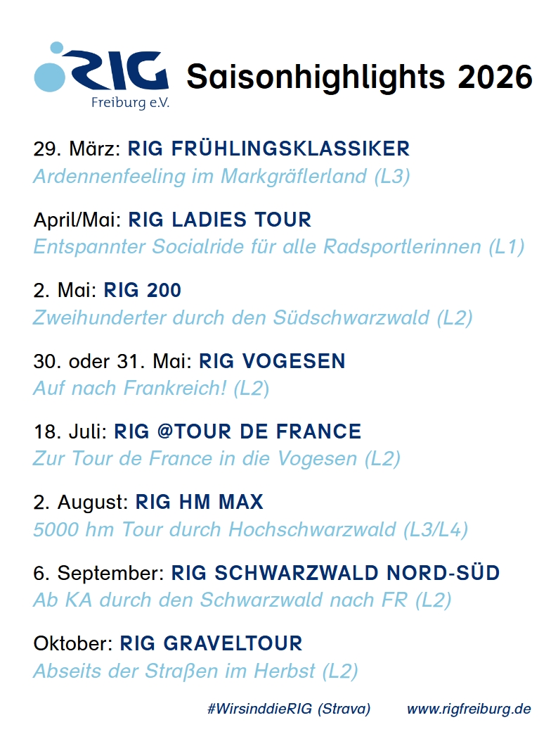 Im April/Mai (Terminierung folgt noch) dürfen sich alle Radsportlerinnen auf die „RIG LADIES TOUR“ mit Natalie und Cynthia freuen. Geplant ist eine entspannte Tour im Bereich Tuniberg/Kaiserstuhl, alles ohne schwierige Anstiege.